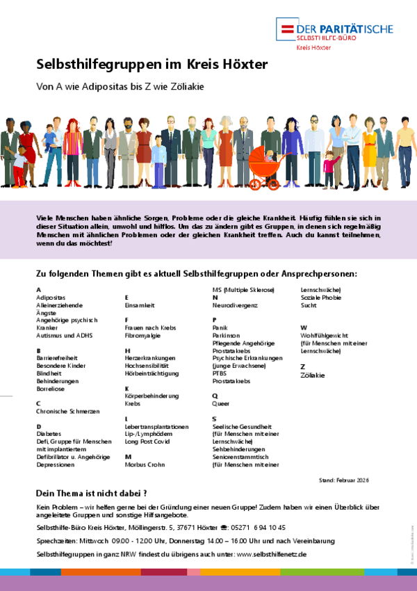 Wenn Sie sich bereits vorab einen Überblick verschaffen wollen, schauen Sie gerne in unser Verzeichnis über die Selbsthilfegruppen im Kreis Höxter, das wir Ihnen auf dieser Seite zum Herunterladen anbieten. Praktisch ist außerdem das Selbsthilfenetz, das Selbsthilfe-Suchportal des Paritätischen NRW. Einfach Ihren Suchbegriff und Ihre Postleitzahl eingeben und schon werden alle passenden Gruppen in der Nähe angezeigt.